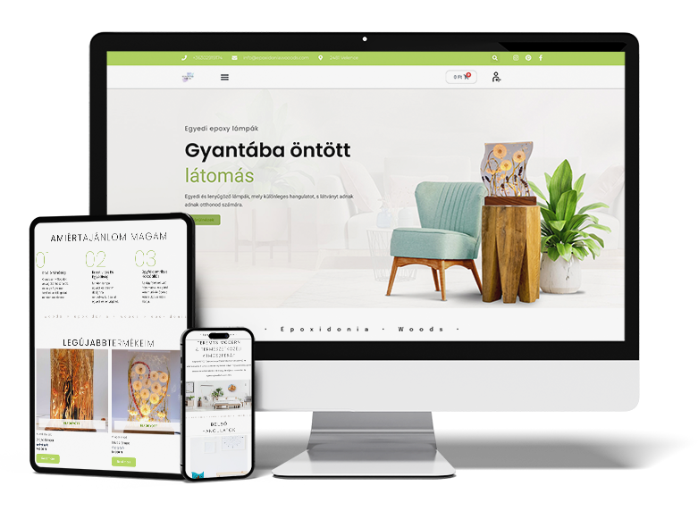Egyedi kézműves fa- és epoxi bútorok, amelyek ötvözik a természetes anyagok melegségét a modern dizájnnal. Az oldal letisztult és elegáns, kiemelve a termékek részletgazdagságát és minőségét.
